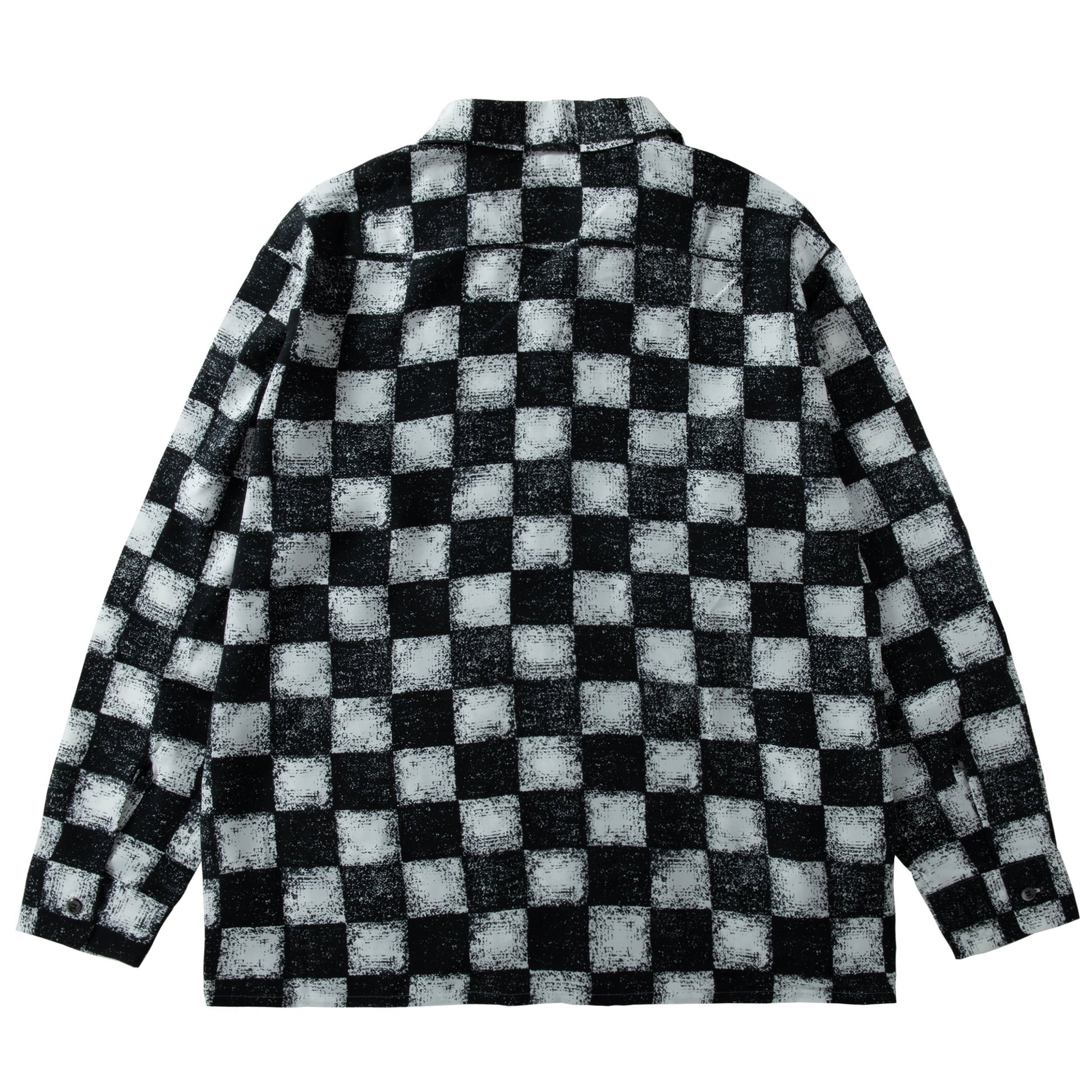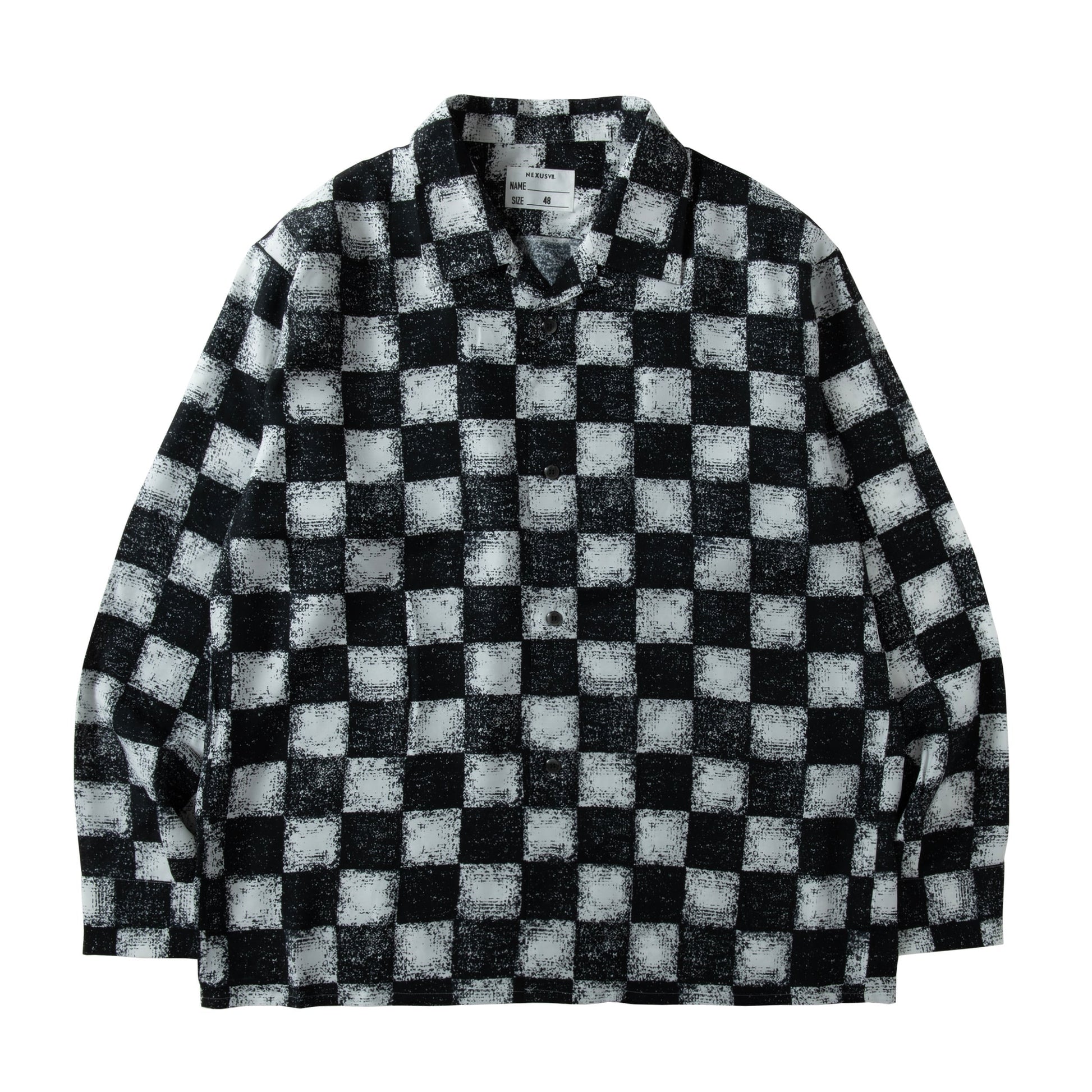 A long-sleeve aloha shirt made from 100% rayon shirt fabric with a drapey feel, featuring NEXUSVII's original checkered flag pattern.