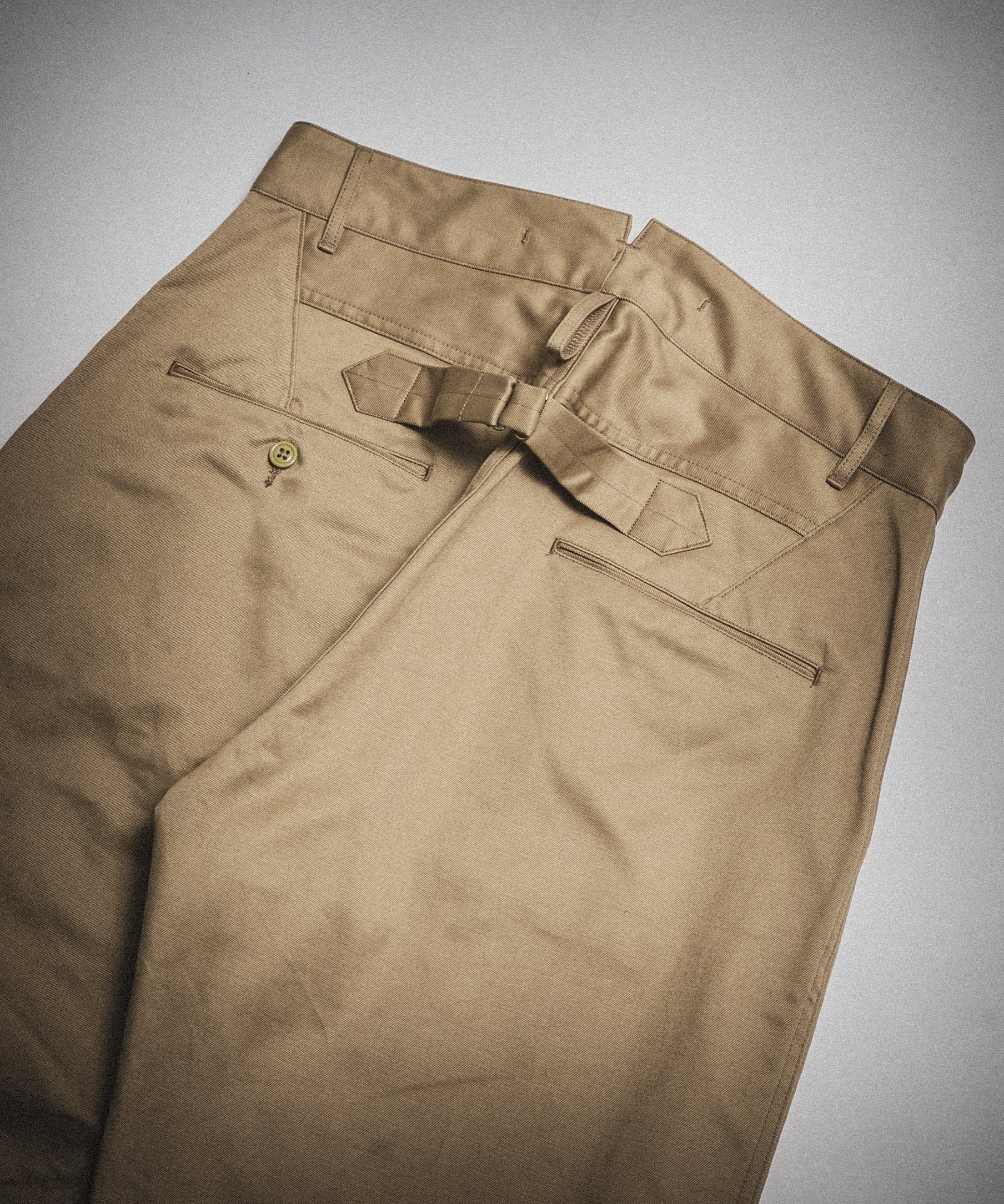 The design of these pants is truly that of a collaboration, mixing the belt loop design of NEXUSVII.'s standard military chinos with the back yoke details of Scye's standard pants.