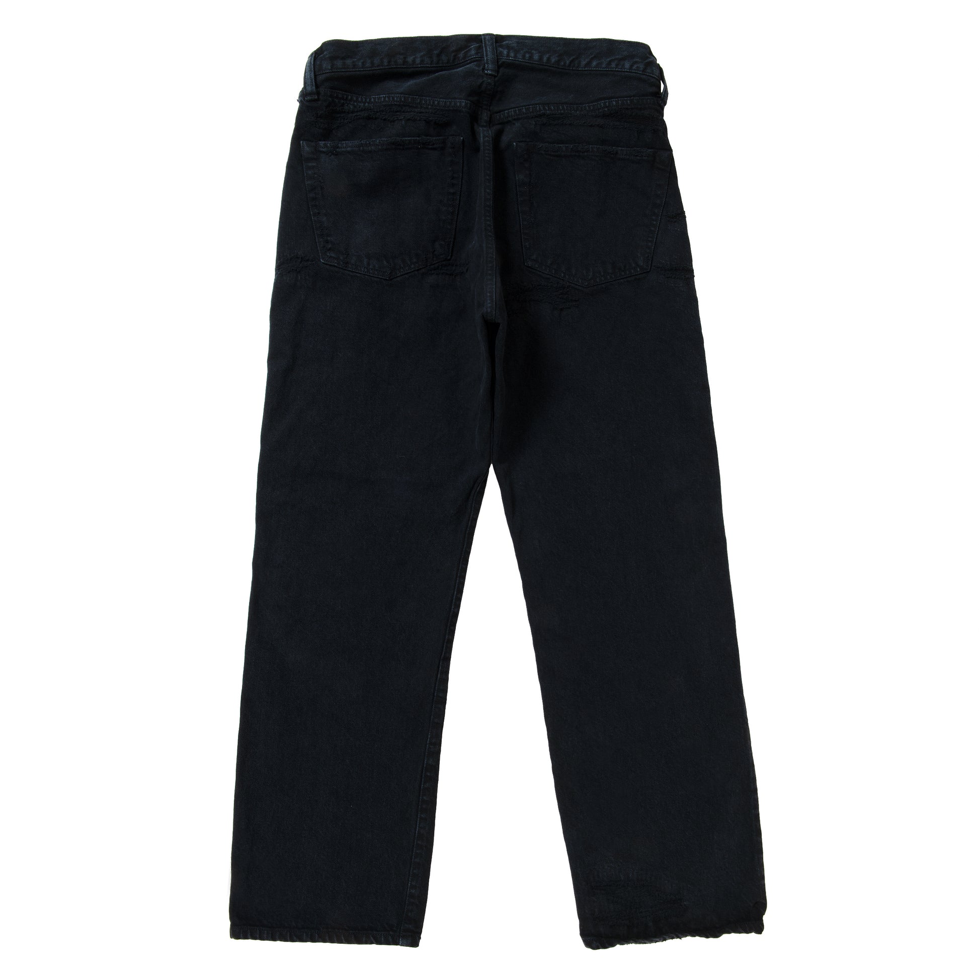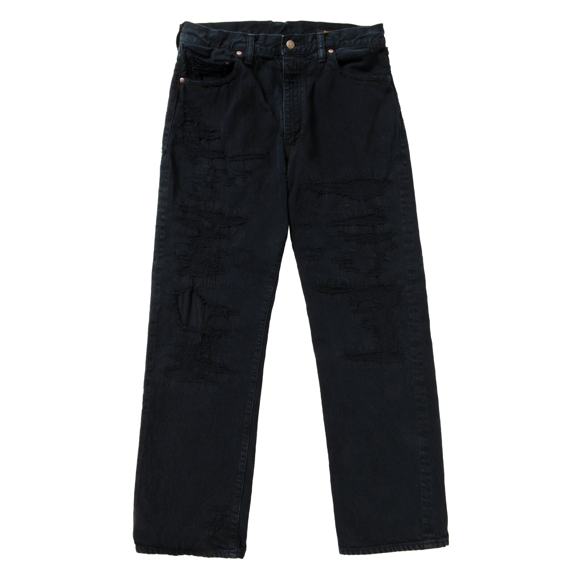生地にはBEYONDEXXのホワイトデニム生地を使用し、デザイナー自身がリペアを繰り返しながら履きこんだデニムパンツのダメージとリペアを再現したデニムをブラックオーバーダイしたデニムです。
